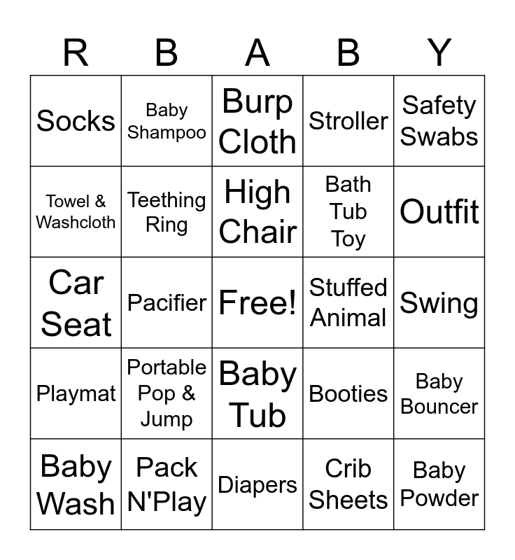 This bingo card has a free space and 31 words: Diapers, Book, Pacifier, Sound Machine, Socks, Burp Cloth, Teething Ring, Booties, Stuffed Animal, Crib Sheets, Swing, Baby Powder, Bib, Onesie, Outfit, Blanket, Baby Bouncer, Portable Pop & Jump, Playmat, Baby Tub, Safety Swabs, Diaper Cream, Baby Wash, Baby Shampoo, Bath Tub Toy, Towel & Washcloth, Stroller, Car Seat, Pack N'Play, High Chair and Bottle Washer.