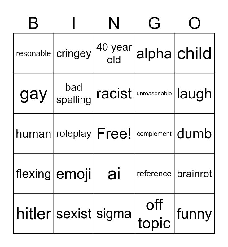 This bingo card has a free space and 24 words: emoji, sexist, racist, hitler, child, resonable, gay, cringey, complement, ai, unreasonable, human, reference, brainrot, bad spelling, off topic, dumb, 40 year old, laugh, roleplay, funny, flexing, alpha and sigma.