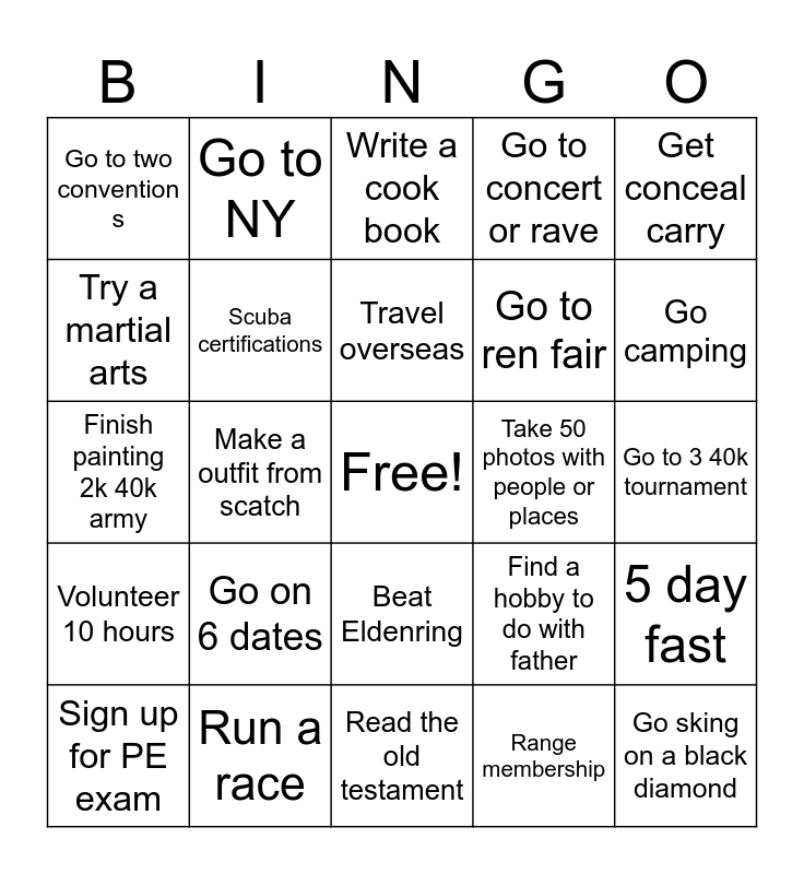 This bingo card has a free space and 24 words: Sign up for PE exam, Go on 6 dates, Travel overseas, Range membership, Get conceal carry, Go to two convention s, Go to NY, Write a cook book, Take 50 photos with people or places, Go to 3 40k tournament, Finish painting 2k 40k army, Scuba certifications, Find a hobby to do with father, 5 day fast, Try a martial arts, Run a race, Read the old testament, Go to concert or rave, Go camping, Volunteer 10 hours, Make a outfit from scatch, Beat Eldenring, Go to ren fair and Go sking on a black diamond.