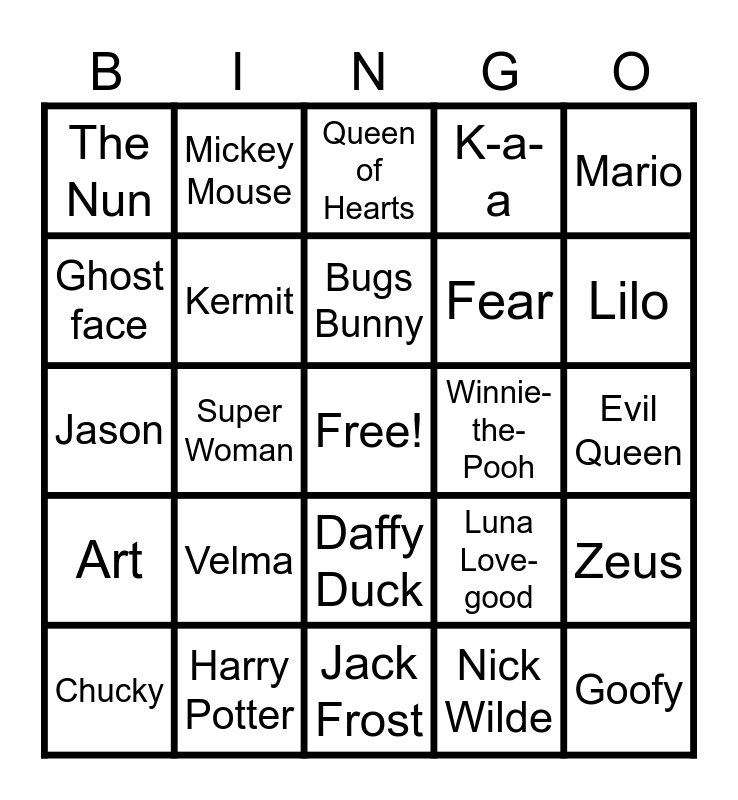 This bingo card has a free space and 24 words: Chucky, Velma, Bugs Bunny, Nick Wilde, Mario, The Nun, Mickey Mouse, Queen of Hearts, Winnie-the-Pooh, Evil Queen, Jason, Kermit, Luna Love-good, Zeus, Ghost face, Harry Potter, Jack Frost, K-a-a, Lilo, Art, Super Woman, Daffy Duck, Fear and Goofy.