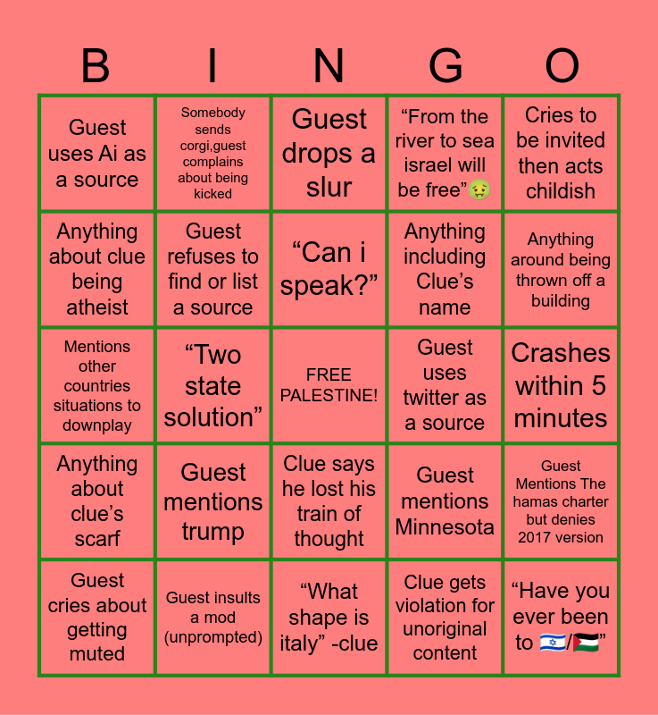 This bingo card has a free space and 85 words: Clue tries to cheat, Clue leads a witness, Guest drops a slur, Guest interrupts and says “let me talk”, Guest rages immediately on panel, Anything to do with clues haircut, Guest says October 7th, Groyper on panel, H-caust denier, Guest references fantasy book, Guest repeats previous guest argument, Live gets shut off because of QR codes, Guest refuses to find or list a source, Guest uses twitter as a source, guest uses telegram as a source, Guest uses Ai as a source, Guest cries about getting muted, Anything about clue being atheist, Served in IDF, Anything about clue “not having a wife”, Anything about clue being 💅, Anything including Clue’s name, “Have you ever been to 🇮🇱/🇵🇸”, “Why dont you go fight for palestine”, “Two state solution”, Brings up religion, Clues phone dies, Guest talks to comments instead of responding to clue, Hates on Liberals/Democrats, “Offers” to buy Clues ticket, Guest mentions trump, Guest mentions venezuela, Guest concedes unprompted, Mentions other countries situations to downplay, Clue calls somebody a dumb name, “IDF is the most moral army”, “What shape is italy” -clue, "I support Israel because im Jewish.", Anything about clue’s scarf, Anything around being thrown off a building, “But im from there”, “TALOS!”, Clue burps and says thats for you and jupiter says say thank you guest, “But i said so”, Guest uses comments to prove point, Mod has to remind clue to reset gift goal in 10 mins, Fingerpads, Fetus tries to come up, Guest crashes out in another language, Clue responds to "What do you do for a living?" With "ur mother"., Somebody sends corgi,guest complains about being kicked, “Can i speak?”, Guest pivots, Dog whistle (comments or panel), “But i have duel citizenship”, Comments insults a mod (unprompted), Guest insults a mod (unprompted), “From the river to sea israel will be free”🤢, Guest types in comments instead of speaking, A username includes politics, A pfp has the Israel flag, A pfp has palestine flag, “You are clueless”, A mod has to correct comments grammer, “Clueless i agree with the username”, Cries to be invited then acts childish, Clue plays ukulele, Guest Mentions The hamas charter but denies 2017 version, Any mention of russia, Guest lists google as a source, Guest says clue is getting paid, Comment says clue is getting paid, Groyper in comments, Somebody calls clue a groyper, Yaps in comments but refuses to come up, Clue says he lost his train of thought, Clue gets violation for unoriginal content, Asks clue “Are you jewish”, @Helpcakes7 in comments, @palilyin in comments, Crashes within 5 minutes, Commenter makes a comment on clues appearance, Clue gets called a dumb name, Guest mentions Minnesota and Guest makes postive claim but wont prove.