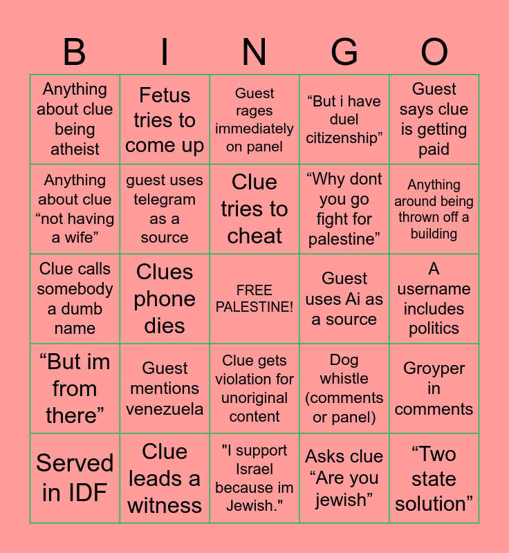 This bingo card has a free space and 84 words: Guest drops a slur, Guest interrupts and says “let me talk”, Guest rages immediately on panel, Anything to do with clues haircut, Guest says October 7th, Groyper on panel, H-caust denier, Guest references fantasy book, Guest repeats previous guest argument, Live gets shut off because of QR codes, Guest refuses to find or list a source, Guest uses twitter as a source, guest uses telegram as a source, Guest uses Ai as a source, Guest cries about getting muted, Anything about clue being atheist, Served in IDF, Anything about clue “not having a wife”, Anything about clue being 💅, Anything including Clue’s name, “Have you ever been to 🇮🇱/🇵🇸”, “Why dont you go fight for palestine”, “Two state solution”, Brings up religion, Clues phone dies, Guest talks to comments instead of responding to clue, Hates on Liberals/Democrats, Tries to turn on camera, “Offers” to buy Clues ticket, Guest mentions trump, Guest mentions venezuela, Guest concedes unprompted, Mentions other countries situations to downplay, Clue calls somebody a dumb name, “IDF is the most moral army”, “What shape is italy” -clue, "I support Israel because im Jewish.", Anything about clue’s scarf, Anything around being thrown off a building, “But im from there”, “TALOS!”, Clue burps and says thats for you and jupiter says say thank you guest, “But i said so”, Guest uses comments to prove point, Mod has to remind clue to reset gift goal in 10 mins, Fingerpads, Fetus tries to come up, Clue responds to "What do you do for a living?" With "ur mother"., Somebody sends corgi,guest complains about being kicked, “Can i speak?”, Guest pivots, Dog whistle (comments or panel), “But i have duel citizenship”, Comments insults a mod (unprompted), Guest insults a mod (unprompted), “From the river to sea israel will be free”🤢, Clue leads a witness, Clue tries to cheat, Guest types in comments instead of speaking, A username includes politics, A pfp has the Israel flag, A pfp has palestine flag, “You are clueless”, A mod has to correct comments grammer, “Clueless i agree with the username”, Cries to be invited then acts childish, Clue plays ukulele, Guest Mentions The hamas charter but denies 2017 version, Guest says clue is getting paid, Comment says clue is getting paid, Groyper in comments, Somebody calls clue a groyper, Yaps in comments but refuses to come up, Clue says he lost his train of thought, Clue gets violation for unoriginal content, Asks clue “Are you jewish”, @Helpcakes7 in comments, @palilyin in comments, @palilyin on panel, Crashes within 5 minutes, Guest comments on clues appearance, Commenter makes a comment on clues appearance, Clue gets called a dumb name and Guest mentions Minnesota.