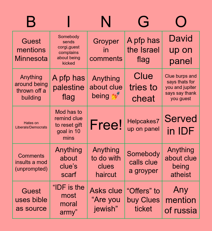 This bingo card has a free space and 87 words: Guest interrupts and says “let me talk”, Guest rages immediately on panel, Anything to do with clues haircut, Guest says October 7th, Groyper on panel, Guest references fantasy book, Guest repeats previous guest argument, Guest refuses to find or list a source, Guest uses twitter as a source, guest uses telegram as a source, Guest uses Ai as a source, Guest cries about getting muted, Anything about clue being atheist, Served in IDF, Anything about clue “not having a wife”, Anything about clue being 💅, Anything including Clue’s name, “Have you ever been to 🇮🇱/🇵🇸”, “Why dont you go fight for palestine”, “Two state solution”, Clues phone dies, Guest talks to comments instead of responding to clue, Hates on Liberals/Democrats, Tries to turn on camera, “Offers” to buy Clues ticket, Guest mentions trump, Guest mentions venezuela, Guest concedes unprompted, Mentions other countries situations to downplay, Clue calls somebody a dumb name, “IDF is the most moral army”, “What shape is italy” -clue, "I support Israel because im Jewish.", Anything about clue’s scarf, Anything around being thrown off a building, “TALOS!”, Clue burps and says thats for you and jupiter says say thank you guest, “But i said so”, Guest uses comments to prove point, Mod has to remind clue to reset gift goal in 10 mins, Fingerpads, Fetus tries to come up, Guest crashes out in another language, Helpcakes7 up on panel, Crist up on panel, David up on panel, Clue responds to "What do you do for a living?" With "ur mother"., Somebody sends corgi,guest complains about being kicked, “Can i speak?”, Guest pivots, Dog whistle (comments or panel), “But i have duel citizenship”, Comments insults a mod (unprompted), Guest insults a mod (unprompted), “From the river to sea israel will be free”🤢, Clue leads a witness, Clue tries to cheat, Guest types in comments instead of speaking, A username includes politics, A pfp has the Israel flag, A pfp has palestine flag, “You are clueless”, A mod has to correct comments grammer, “Clueless i agree with the username”, Cries to be invited then acts childish, Clue plays ukulele, Guest Mentions The hamas charter but denies 2017 version, Guest uses bible as source, Any mention of russia, Guest lists google as a source, Guest says clue is getting paid, Comment says clue is getting paid, Groyper in comments, Somebody calls clue a groyper, Yaps in comments but refuses to come up, Clue says he lost his train of thought, Clue gets violation for unoriginal content, Asks clue “Are you jewish”, @Helpcakes7 in comments, @palilyin in comments, @palilyin on panel, Crashes within 5 minutes, Guest comments on clues appearance, Commenter makes a comment on clues appearance, Clue gets called a dumb name, Guest mentions Minnesota and Guest makes postive claim but wont prove.