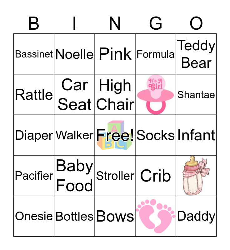 This bingo card has 4 images, a free space and 24 words: Rattle, Pink, Noelle, Pacifier, Socks, Onesie, Diaper, Formula, Bottles, Bows, Shantae, Diaper Bag, Baby Food, Car Seat, High Chair, Stroller, Bassinet, Mommy, Daddy, Walker, Infant, Crib, Teddy Bear and Baby Powder.