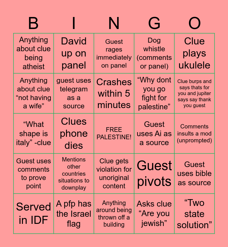 This bingo card has a free space and 83 words: Guest drops a slur, Guest interrupts and says “let me talk”, Guest rages immediately on panel, Anything to do with clues haircut, Guest says October 7th, Groyper on panel, H-caust denier, Guest references fantasy book, Guest repeats previous guest argument, Live gets shut off because of QR codes, Guest refuses to find or list a source, Guest uses twitter as a source, guest uses telegram as a source, Guest uses Ai as a source, Guest cries about getting muted, Anything about clue being atheist, Served in IDF, Anything about clue “not having a wife”, Anything about clue being 💅, Anything including Clue’s name, “Have you ever been to 🇮🇱/🇵🇸”, “Why dont you go fight for palestine”, “Two state solution”, Brings up religion, Clues phone dies, Guest talks to comments instead of responding to clue, “Offers” to buy Clues ticket, Guest mentions trump, Guest mentions venezuela, Guest concedes unprompted, Mentions other countries situations to downplay, Clue calls somebody a dumb name, “IDF is the most moral army”, “What shape is italy” -clue, "I support Israel because im Jewish.", Anything about clue’s scarf, Anything around being thrown off a building, “TALOS!”, Clue burps and says thats for you and jupiter says say thank you guest, Guest uses comments to prove point, Mod has to remind clue to reset gift goal in 10 mins, Fingerpads, Fetus tries to come up, Guest crashes out in another language, Helpcakes7 up on panel, Crist up on panel, David up on panel, Clue responds to "What do you do for a living?" With "ur mother"., Somebody sends corgi,guest complains about being kicked, “Can i speak?”, Guest pivots, Dog whistle (comments or panel), Comments insults a mod (unprompted), Guest insults a mod (unprompted), “From the river to sea israel will be free”🤢, Clue leads a witness, Guest types in comments instead of speaking, A username includes politics, A pfp has the Israel flag, A pfp has palestine flag, “You are clueless”, A mod has to correct comments grammer, “Clueless i agree with the username”, Clue plays ukulele, Guest Mentions The hamas charter but denies 2017 version, Guest uses bible as source, Any mention of russia, Guest lists google as a source, Guest says clue is getting paid, Comment says clue is getting paid, Groyper in comments, Somebody calls clue a groyper, Yaps in comments but refuses to come up, Clue gets violation for unoriginal content, Asks clue “Are you jewish”, @Helpcakes7 in comments, @palilyin in comments, Crashes within 5 minutes, Guest comments on clues appearance, Commenter makes a comment on clues appearance, Clue gets called a dumb name, Guest mentions Minnesota and Guest makes postive claim but wont prove.