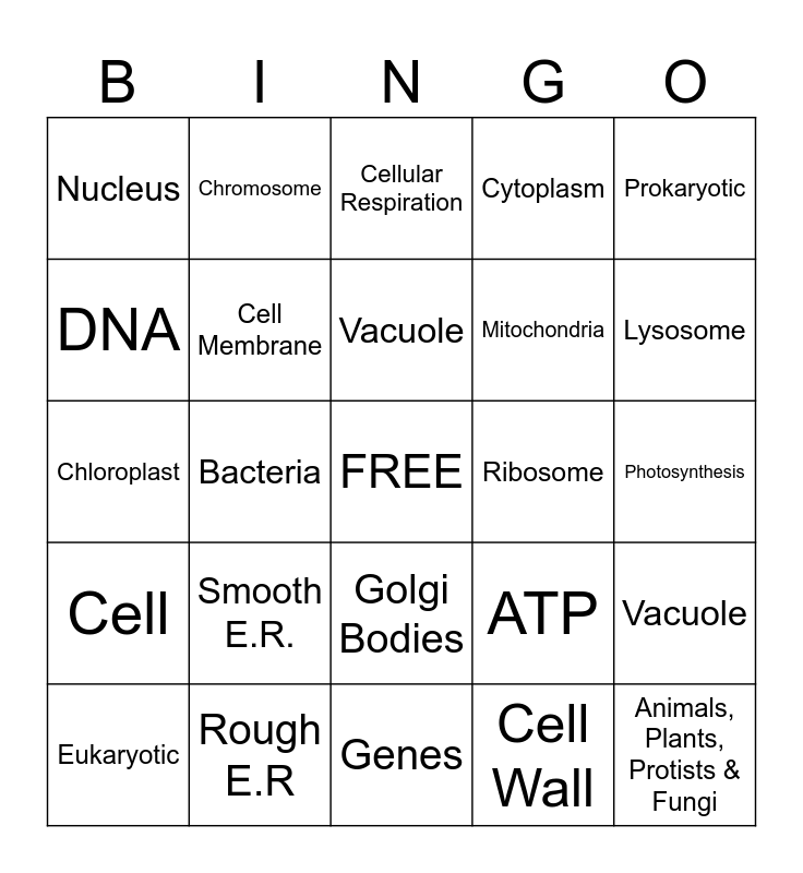 This bingo card has a free space and 24 words: Smooth E.R., Rough E.R, Vacuole, Eukaryotic, Prokaryotic, Nucleus, DNA, Chromosome, Ribosome, Golgi Bodies, Mitochondria, Chloroplast, ATP, Vacuole, Cell Membrane, Cell Wall, Photosynthesis, Cellular Respiration, Lysosome, Bacteria, Animals, Plants, Protists & Fungi, Cell, Cytoplasm and Genes.
