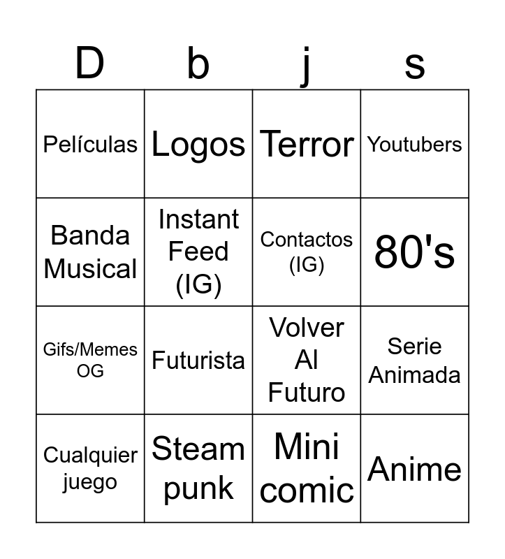 This bingo card has 16 words: Cualquier juego, Steam punk, Terror, Youtubers, Banda Musical, Logos, Volver Al Futuro, Serie Animada, Películas, Instant Feed (IG), Mini comic, 80's, Gifs/Memes OG, Futurista, Contactos (IG) and Anime.