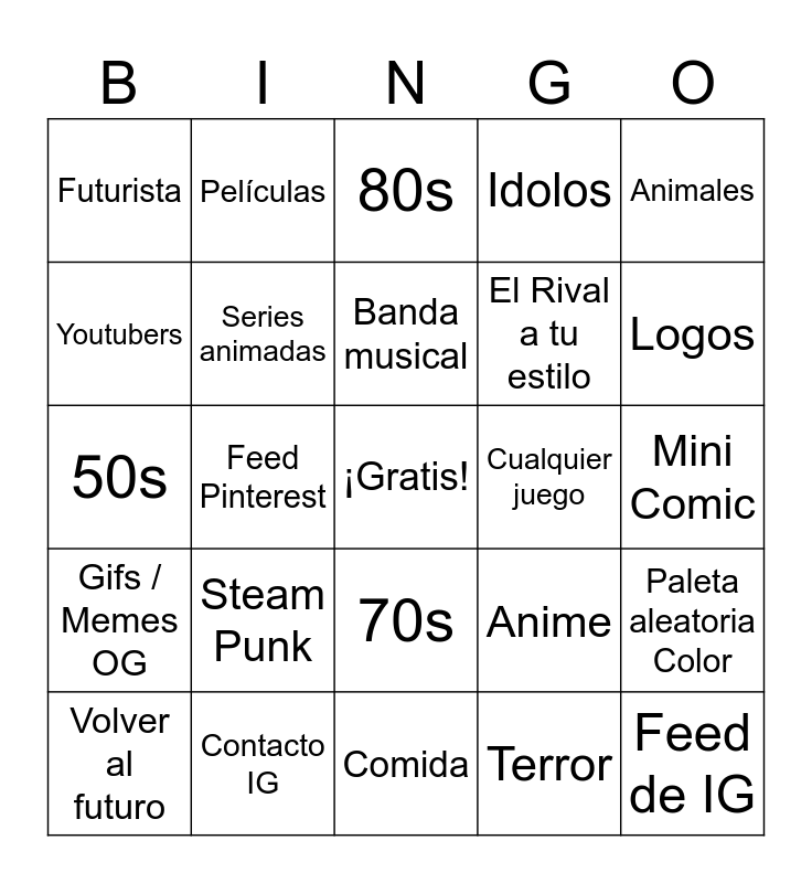 This bingo card has a free space and 24 words: Volver al futuro, Steam Punk, Banda musical, Terror, Animales, Futurista, Películas, 80s, Cualquier juego, Mini Comic, 50s, Series animadas, Anime, Paleta aleatoria Color, Youtubers, Contacto IG, Comida, Idolos, Logos, Gifs / Memes OG, Feed Pinterest, 70s, El Rival a tu estilo and Feed de IG.