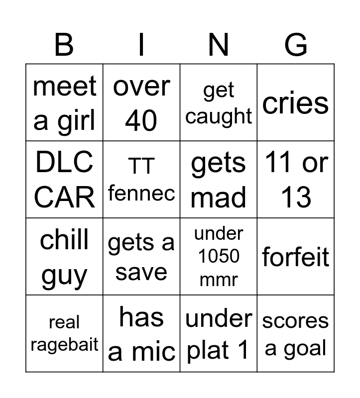 This bingo card has 16 words: has a mic, forfeit, get caught, meet a girl, chill guy, over 40, under 1050 mmr, under plat 1, DLC CAR, TT fennec, real ragebait, cries, gets a save, 11 or 13, gets mad and scores a goal.