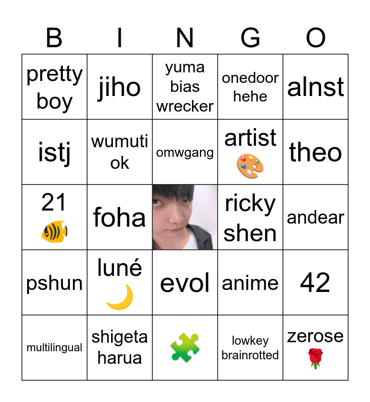 This bingo card has a free space and 24 words: luné 🌙, shigeta harua, omwgang, multilingual, alnst, pretty boy, istj, jiho, ricky shen, evol, artist 🎨, 21 🐠, anime, 42, wumuti ok, lowkey brainrotted, andear, yuma bias wrecker, theo, foha, zerose 🌹, pshun, onedoor hehe and 🧩.