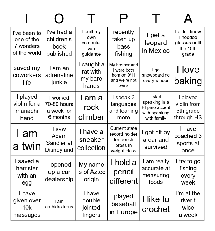 This bingo card has 36 words: I hold a pencil different, My name is of Aztec origin, played baseball in Europe, saved my coworkers life, I am a twin, I speak 3 languages and leaning more, I am an adrenaline junkie, I have double jointed fingers, I pet a leopard in Mexico, I am really accurate at measuring foods, I love baking, recently taken up bass fishing, I try to go fishing every week, I worked 70-80 hours a week for 6 months, My brother and I were both born on 9/11 and we're not twins, I've been to one of the 7 wonders of the world, I saved a hamster with an egg, I start speaking in a Filipino accent with speaking with family, I played violin for a mariachi band, I built my own computer w/o guidance, I am a rock climber, I saw Adam Sandler at Disneyland, Current state record holder for bench press in weight class, I have a sneaker collection, I got hit by a car and survived, I've had a children's book published, I go snowboarding every winder, I am ambidextrous, I caught a rat with my bare hands, I didn't know I needed glasses until the 10th grade, I'm at the river twice a week, I have given over 10k massages, I have coached 3 sports at once, I played violin from 5th grade through HS, I opened up a car dealership and I like to crochet.