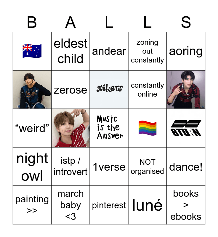 This bingo card has 5 images, a free space and 19 words: istp / introvert, march baby <3, painting >>, aoring, 🇦🇺, eldest child, 🏳️🌈, 1verse, constantly online, “weird”, NOT organised, dance!, zerose, luné, andear, books > ebooks, night owl, zoning out constantly and pinterest.