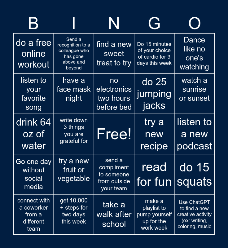This bingo card has a free space and 24 words: try a new fruit or vegetable, get 10,000 + steps for two days this week, no electronics two hours before bed, connect with a coworker from a different team, Dance like no one's watching, do a free online workout, listen to your favorite song, Send a recognition to a colleague who has gone above and beyond, try a new recipe, send a compliment to someone from outside your team, do 25 jumping jacks, drink 64 oz of water, read for fun, do 15 squats, have a face mask night, make a playlist to pump yourself up for the work week, listen to a new podcast, find a new sweet treat to try, watch a sunrise or sunset, write down 3 things you are grateful for, Use ChatGPT to find a new creative activity (ex: writing, coloring, music, Go one day without social media, Do 15 minutes of your choice of cardio for 3 days this week and take a walk after school.