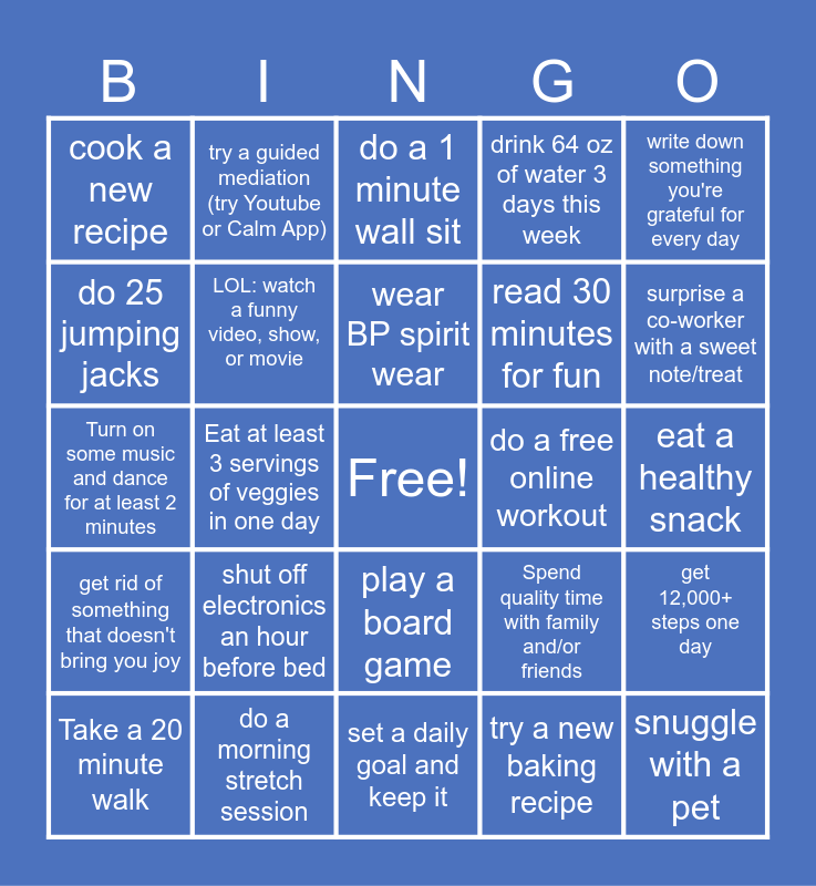 This bingo card has a free space and 24 words: shut off electronics an hour before bed, do a morning stretch session, wear BP spirit wear, Take a 20 minute walk, write down something you're grateful for every day, cook a new recipe, do 25 jumping jacks, try a guided mediation (try Youtube or Calm App), do a free online workout, play a board game, read 30 minutes for fun, Turn on some music and dance for at least 2 minutes, Spend quality time with family and/or friends, get 12,000+ steps one day, LOL: watch a funny video, show, or movie, try a new baking recipe, eat a healthy snack, do a 1 minute wall sit, surprise a co-worker with a sweet note/treat, Eat at least 3 servings of veggies in one day, snuggle with a pet, get rid of something that doesn't bring you joy, drink 64 oz of water 3 days this week and set a daily goal and keep it.