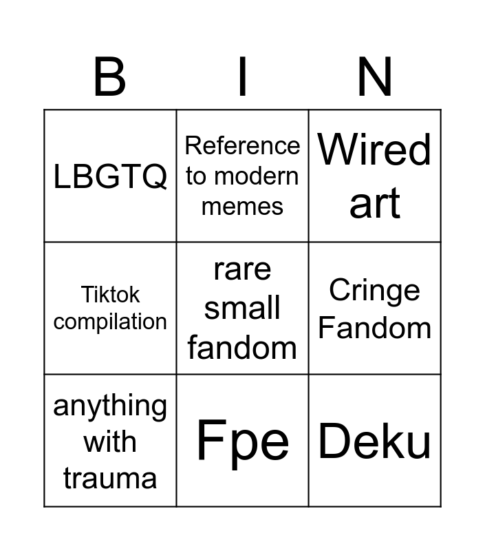 This bingo card has a free space and 8 words: Cringe Fandom, Wired art, Reference to modern memes, anything with trauma, LBGTQ, Deku, Tiktok compilation and Fpe.