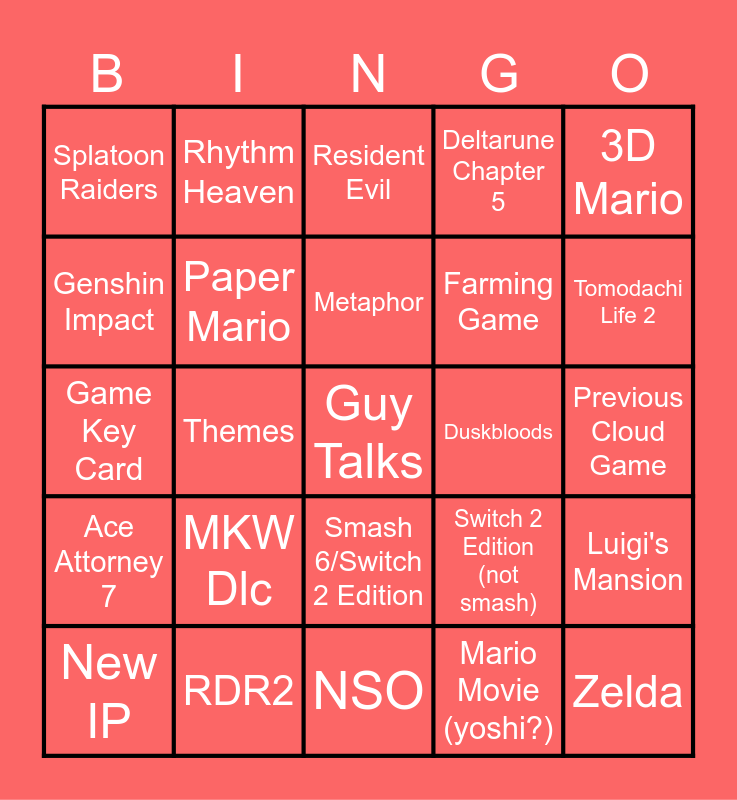 This bingo card has a free space and 24 words: MKW Dlc, RDR2, Metaphor, New IP, 3D Mario, Splatoon Raiders, Genshin Impact, Rhythm Heaven, Duskbloods, Smash 6/Switch 2 Edition, Farming Game, Game Key Card, Switch 2 Edition (not smash), Luigi's Mansion, Paper Mario, Mario Movie (yoshi?), Previous Cloud Game, Resident Evil, Tomodachi Life 2, Themes, Zelda, Ace Attorney 7, Deltarune Chapter 5 and NSO.