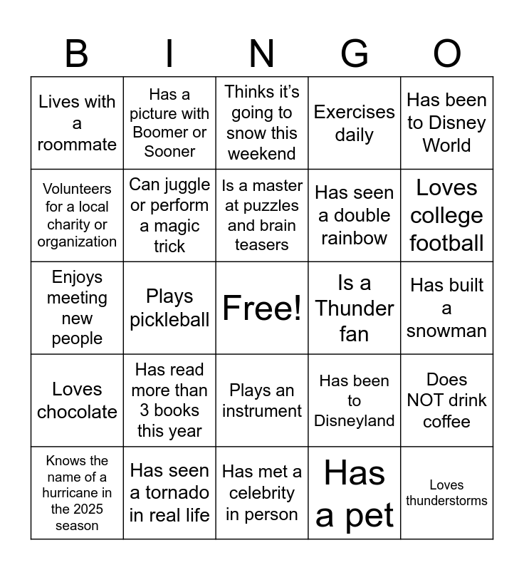 This bingo card has a free space and 24 words: Has read more than 3 books this year, Has seen a tornado in real life, Is a master at puzzles and brain teasers, Knows the name of a hurricane in the 2025 season, Has been to Disney World, Lives with a roommate, Volunteers for a local charity or organization, Has a picture with Boomer or Sooner, Is a Thunder fan, Plays an instrument, Has seen a double rainbow, Enjoys meeting new people, Has been to Disneyland, Does NOT drink coffee, Can juggle or perform a magic trick, Has a pet, Has built a snowman, Thinks it’s going to snow this weekend, Loves college football, Plays pickleball, Loves thunderstorms, Loves chocolate, Exercises daily and Has met a celebrity in person.