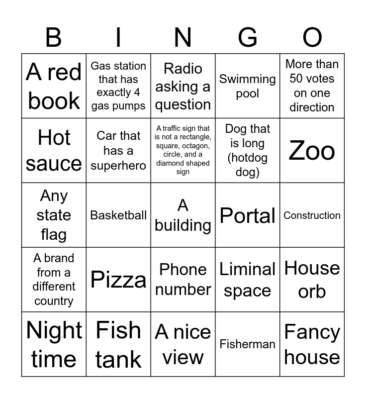This bingo card has a free space and 24 words: Pizza, Fish tank, A traffic sign that is not a rectangle, square, octagon, circle, and a diamond shaped sign, Night time, More than 50 votes on one direction, A red book, Hot sauce, Gas station that has exactly 4 gas pumps, Portal, Phone number, Dog that is long (hotdog dog), Any state flag, Liminal space, House orb, Car that has a superhero, Fisherman, Construction, Radio asking a question, Zoo, Basketball, Fancy house, A brand from a different country, Swimming pool and A nice view.