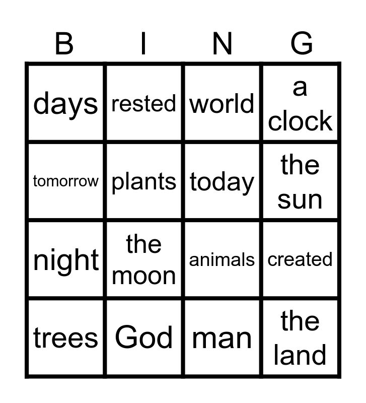 This bingo card has 16 words: God, created, world, days, night, rested, animals, man, tomorrow, plants, trees, a clock, the moon, the sun, today and the land.