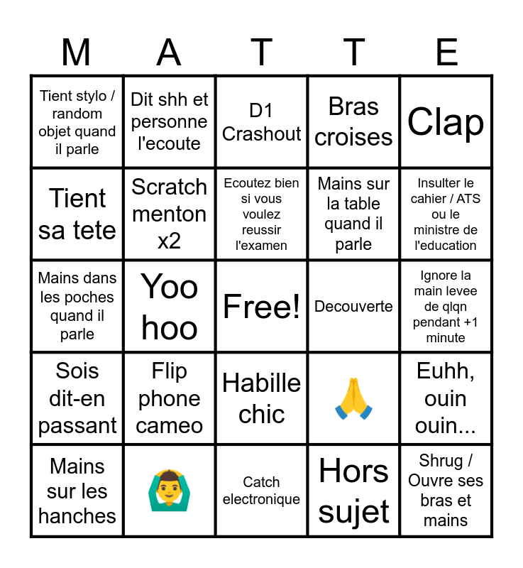 This bingo card has a free space and 32 words: Hors sujet, Avion, Yoo hoo, ☝, Sois dit-en passant, Scratch menton x2, Clap, Euhh, ouin ouin..., Dit shh et personne l'ecoute, Genous plies/crouch down, Ecoutez bien si vous voulez reussir l'examen, D1 Crashout, Te fixe quand il explique quelque chose, Genie Aero / PontPop, Decouverte, Eh, est-ce que ca vous interesse ou ca vous interesse pas?, Mains sur les hanches, Mains dans les poches quand il parle, Habille chic, Flip phone cameo, 🙏, Hihihi, Ignore la main levee de qlqn pendant +1 minute, 🙆♂️, Shrug / Ouvre ses bras et mains, Bras croises, Mains sur la table quand il parle, Tient sa tete, Tient stylo / random objet quand il parle, Catch electronique, Parler des personnes qui ont cree le cahier d'activite and Insulter le cahier / ATS ou le ministre de l'education.