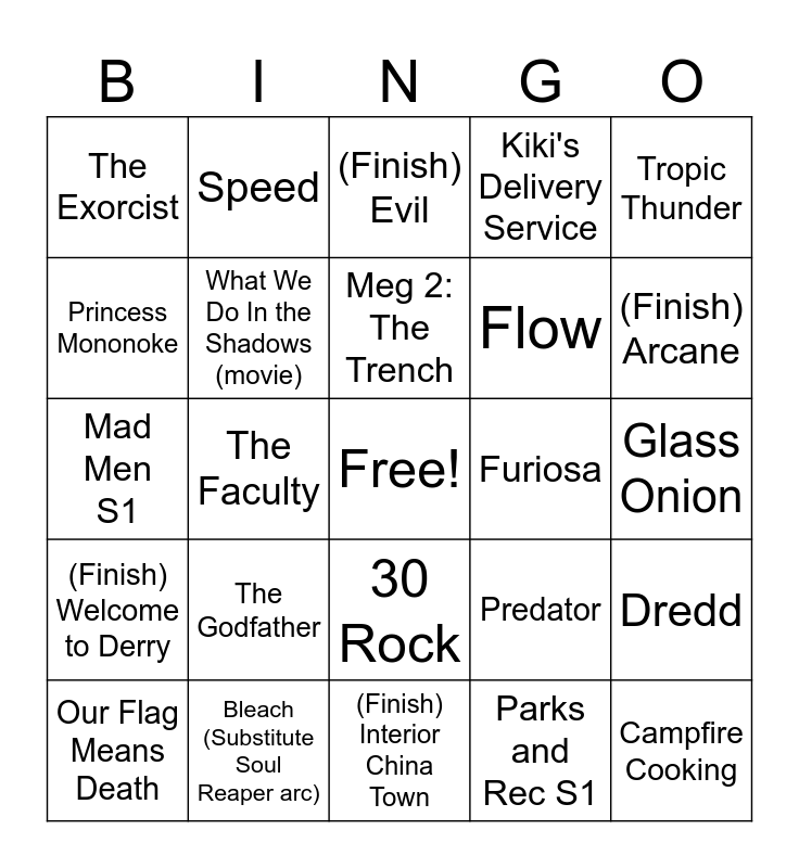 This bingo card has a free space and 24 words: The Godfather, Bleach (Substitute Soul Reaper arc), Meg 2: The Trench, Our Flag Means Death, Tropic Thunder, The Exorcist, Princess Mononoke, Speed, Furiosa, 30 Rock, Flow, Mad Men S1, Predator, Dredd, What We Do In the Shadows (movie), Parks and Rec S1, Glass Onion, (Finish) Evil, (Finish) Arcane, The Faculty, Campfire Cooking, (Finish) Welcome to Derry, Kiki's Delivery Service and (Finish) Interior China Town.