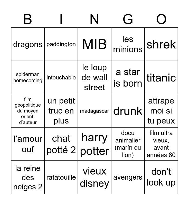 This bingo card has a free space and 24 words: chat potté 2, ratatouille, le loup de wall street, la reine des neiges 2, shrek, dragons, spiderman homecoming, paddington, drunk, harry potter, a star is born, film géopolitique du moyen orient, d’auteur, docu animalier (marín ou lion), film ultra vieux, avant années 80, intouchable, avengers, attrape moi si tu peux, MIB, titanic, un petit truc en plus, don’t look up, l’amour ouf, les minions and vieux disney.