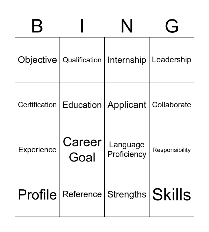This bingo card has 18 words: Career Goal, Skills, Internship, Objective, Language Proficiency, Leadership, Profile, Qualification, Collaborate, Experience, Strengths, Certification, Responsibility, Education, Applicant, Achievement, Reference and Accomplishment.