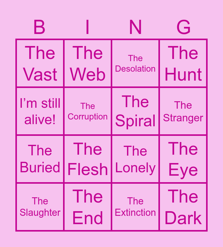 This bingo card has 16 words: The End, The Eye, The Desolation, The Vast, The Buried, The Web, The Lonely, The Extinction, I’m still alive!, The Corruption, The Slaughter, The Hunt, The Flesh, The Stranger, The Spiral and The Dark.