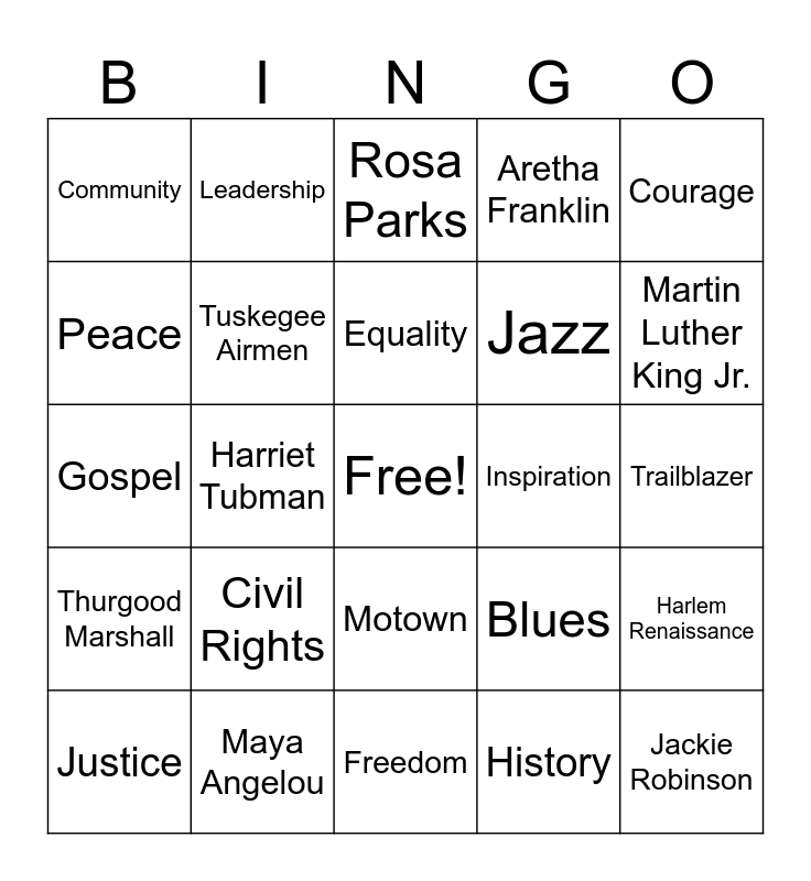 This bingo card has a free space and 25 words: Civil Rights, Freedom, Equality, Justice, Courage, Community, Peace, Leadership, Inspiration, Motown, Jazz, Gospel, Blues, Harlem Renaissance, Tuskegee Airmen, HBCU, Trailblazer, Rosa Parks, Martin Luther King Jr., Harriet Tubman, Jackie Robinson, Maya Angelou, Thurgood Marshall, Aretha Franklin and History.