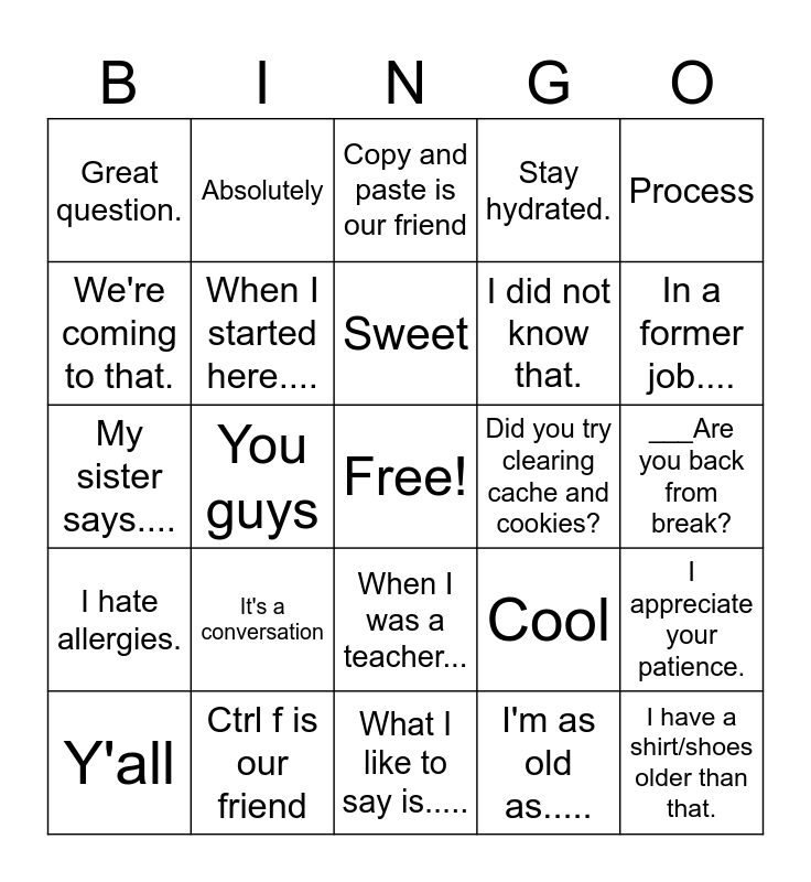This bingo card has a free space and 24 words: It's a conversation, Ctrl f is our friend, Sweet, Y'all, Process, Great question., We're coming to that., Absolutely, Did you try clearing cache and cookies?, When I was a teacher..., I did not know that., My sister says...., Cool, I appreciate your patience., When I started here...., I'm as old as....., ___Are you back from break?, Copy and paste is our friend, In a former job...., You guys, I have a shirt/shoes older than that., I hate allergies., Stay hydrated. and What I like to say is......