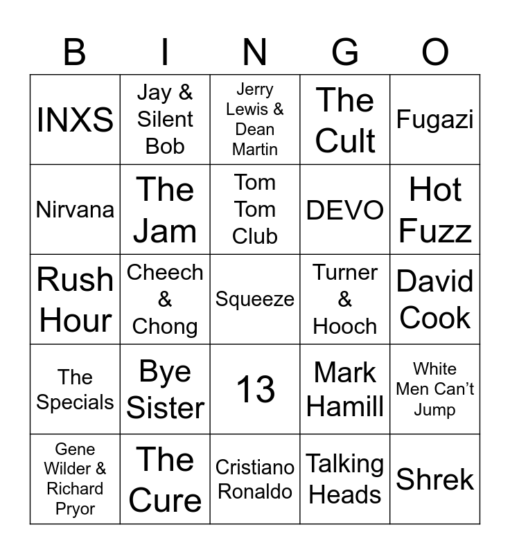 This bingo card has 60 words: Violent Femmes, The Cure, The Clash, The Specials, Talking Heads, Echo & The Bunnymen, The Jam, The Romantics, DEVO, The Smiths, The Cult, The The, Nirvana, Pixies, The Psychedelic Furs, INXS, Squeeze, Fugazi, The Jesus and Mary Chain, Tom Tom Club, Turner & Hooch, Jerry Lewis & Dean Martin, Gene Wilder & Richard Pryor, White Men Can’t Jump, Superbad, Romy & Michelle, Beavis & Butthead, Harold & Kumar, Hot Fuzz, Men in Black, Dumb and Dumber, Planes, Trains, and Automobiles, Tommy Boy, Step Brothers, Jay & Silent Bob, Wayne’s World, The Blues Brothers, Cheech & Chong, I Love You, Man, Rush Hour, Scientology, Bye Sister, David Cook, David Archuleta, Mark Hamill, Jonathan Bailey, Nathan Lane, Alan Cumming, 21, 13, Cristiano Ronaldo, Baby Shark Dance, 11, Robert Downey Jr., Snakes, Grogu, Baxter, Progressive, Shrek and Chicago.