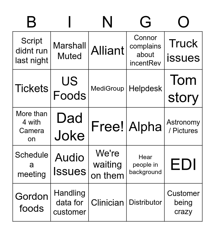 This bingo card has a free space and 72 words: Weather Chat, Marshall Muted, Dad Joke, Alrighty, Lets get rollin, Specific Food Issue, Connor complains about incentRev, Call us if you need us, Helpdesk, USDA, Gordon foods, Who has PTO, Tom story, Script didnt run last night, Less than 4 with Camera on, More than 4 with Camera on, Hear people in background, Truck issues, "XX stay on after this call", Astronomy / Pictures, Audio Issues, Customer being crazy, EDI, Hop on another call, Somebody eating, What else we got?, Marshall security update, Anything else?, incentRev deals run ok?, Missing Contracts, Handling data for customer, Ill forward you that email, Merge Request, We're in testing, Distributor, Invoices, Premier, Blackbaud, Tickets, Snellgrove, We're waiting on them, Yardy, Widget, Waiting on the data to load, "Doesn't make sense", Schedule a meeting, 855s, Price File, Not able to replicate, Landed Errors, Mobile apps, You're muted, Punchout, Alpha, Problematic, Ottomate, Alliant, MediGroup, GLC, We'll monitor it, Tom technical question, More locations, Is Marshall On?, Clinician, OrthoMonitor, AS2, US Foods, Ship To, Demo, Go Live, Ping and GFS.