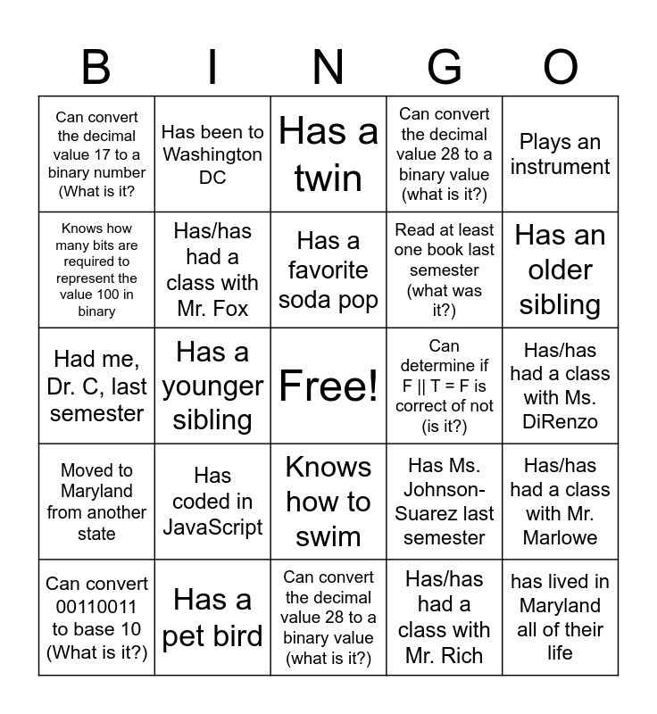 This bingo card has a free space and 24 words: Has coded in JavaScript, Has a pet bird, Has a favorite soda pop, Can convert 00110011 to base 10 (What is it?), Plays an instrument, Can convert the decimal value 17 to a binary number (What is it?, Knows how many bits are required to represent the value 100 in binary, Has been to Washington DC, Can determine if F || T = F is correct of not (is it?), Knows how to swim, Read at least one book last semester (what was it?), Had me, Dr. C, last semester, Has Ms. Johnson-Suarez last semester, Has/has had a class with Mr. Marlowe, Has/has had a class with Mr. Fox, Has/has had a class with Mr. Rich, Has/has had a class with Ms. DiRenzo, Has a twin, Has an older sibling, Has a younger sibling, has lived in Maryland all of their life, Moved to Maryland from another state, Can convert the decimal value 28 to a binary value (what is it?) and Can convert the decimal value 28 to a binary value (what is it?).