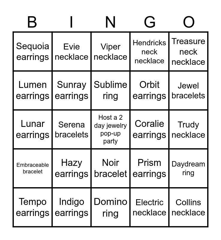 This bingo card has a free space and 24 words: Hazy earrings, Indigo earrings, Sublime ring, Tempo earrings, Treasure neck necklace, Sequoia earrings, Lumen earrings, Evie necklace, Coralie earrings, Noir bracelet, Orbit earrings, Lunar earrings, Prism earrings, Daydream ring, Sunray earrings, Electric necklace, Trudy necklace, Viper necklace, Jewel bracelets, Serena bracelets, Collins necklace, Embraceable bracelet, Hendricks neck necklace and Domino ring.
