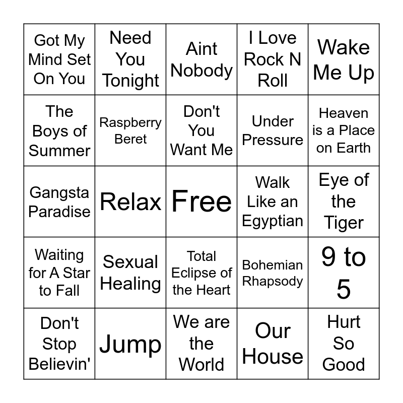 This bingo card has a free space and 59 words: Walking On Sunshine, Jump, Livin' on a Prayer, Waiting for A Star to Fall, Our House, Uptown Girl, Raspberry Beret, Come On Eileen, Under Pressure, Summer of '69, I Love Rock N Roll, Walk of Life, The Boys of Summer, Like A Prayer, Like A Virgin, Got My Mind Set On You, Hurt So Good, Wake Me Up, Love Shack, Don't You Want Me, Walk Like an Egyptian, Aint Nobody, Don't Stop Believin', 9 to 5, Hip to be Square, 867-5309 Jenny, You Can Call Me Al, Get Down On It, Heaven is a Place on Earth, You Can't Hurry Love, Take On Me, Thriller, Invisible Touch, Livin' On A Prayer, Need You Tonight, We Built this City, Macarena, Relax, Word Up, Gangsta Paradise, Wake Me Up Before You Go, Sexual Healing, Eye of the Tiger, Danger Zone, I Wanna Dance with Somebody, Sweet Child of Mine, Funky Town, Kiss, Total Eclipse of the Heart, We are the World, Walk This Way, Jessie's Girl, What's Up, Sweet Dreams, We Belong, Bohemian Rhapsody, Listen to Your Heart, Purple Rain and I'm Still Standing.