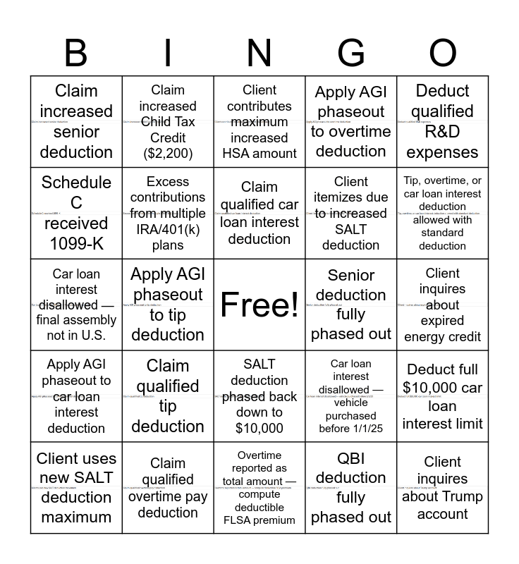 This bingo card has 24 images, a free space and 24 words: Claim qualified tip deduction, Claim qualified overtime pay deduction, Claim qualified car loan interest deduction, Client uses new SALT deduction maximum, Deduct qualified R&D expenses, Claim increased senior deduction, Schedule C received 1099-K, Claim increased Child Tax Credit ($2,200), Senior deduction fully phased out, SALT deduction phased back down to $10,000, Client itemizes due to increased SALT deduction, Car loan interest disallowed — final assembly not in U.S., Car loan interest disallowed — vehicle purchased before 1/1/25, Deduct full $10,000 car loan interest limit, Excess contributions from multiple IRA/401(k) plans, QBI deduction fully phased out, Client inquires about expired energy credit, Client contributes maximum increased HSA amount, Tip, overtime, or car loan interest deduction allowed with standard deduction, Apply AGI phaseout to tip deduction, Client inquires about Trump account, Apply AGI phaseout to car loan interest deduction, Apply AGI phaseout to overtime deduction and Overtime reported as total amount — compute deductible FLSA premium.