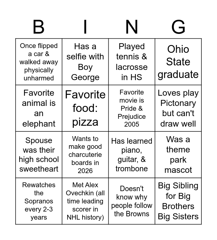 This bingo card has 88 words: Free!, Lifetime East Sider, Has a pet elephant, Currently studying Spanish on Duolingo, Disassembled & reassembled a vintage motorcycle and its engine, Mint & hot chococlate = terrible flavor combo, Studied/Lived abroad in Italy for a summer, Favorite movies are the Godfather Part I & II, Was in a touring metal band, Smells Like Teen Spirit is a terrible song, Went to a women's college, Fave coffee place: Kleifeld's in Willoughby, Has 4 children, Doesn't know why people follow the Browns, Can't wink, Loves play Pictonary but can't draw well, Wants to re-learn to ski in 2026, Was in a TV commercial with HS marching band, Builds model kits to relax, Has 5 kids (living), Collects sneakers, Has hosted a podcast, Has learned piano, guitar, & trombone, Irrationally afraid of horses, Favorite holiday is St Patrick's Day, 1995 BBC Pride & Prejudice is superior to 2005 Pride & Prejudice, Attended opening match of 2011 FIFA Women's World Cup in Berlin, Studied abroad in Africa, From Maryland, Has 13 tattoos, Played tennis & lacrosse in HS, Ohio State graduate, Met U2, Had an African Albino frog, Got knocked over (and caught!) by Jon Stewart, Favorite food: pizza, Once flipped a car & walked away physically unharmed, Has a vegetable garden, Youngest of 2 children, Wants to make good charcuterie boards in 2026, Was a theme park mascot, Regular yoga practitioner for almost 20 years, Can say the alphabet backward, Classically trained artist, Met Alex Ovechkin (all time leading scorer in NHL history), Favorite meal of the day is lunch, Sang in a samba band, Studied abroad in Manchester, England, Went to college with David Bowie's son (Duncan Jones), Spouse was their high school sweetheart, Wish leggings would come back in trend, Running a half marathon in 2026, Favorite movie is Batman w/Michael Keaton, Loves Diet Coke, Childhood nickname was "Buck 1000", Loves word seek puzzles/other word games, Big Sibling for Big Brothers Big Sisters, Has a selfie with Boy George, Favorite animal is a cheetah, Donuts are overrated, Favorite artist is Beyonce, Louisiana State grad, Has a Halloween Movie franchise collection, Middle name is Kirkland, Read 155 books in 2025, Favorite reality show is Naked & Afraid, Has "morning to midnight Friendsgiving" tradition, Favorite movie is Pride & Prejudice 2005, Took 72-hour unchartered bus trip to Mexico City, Rewatches the Sopranos every 2-3 years, Favorite place is Cleveland Museum of Art, Took surfing lessons, Takes pictures of fat squirrels in winter, Favorite animal is an elephant, Favorite TV show is Ted Lasso, Has been to 9 countries, Not had a sip of coffee in nearly 6 years, Met spouse at University of Minnesota, Favorite TV show is JEOPARDY!, Favorite book: A Walk in the Woods by Bill Bryson, Preferred pizza toppings: artichokes & pine nuts, Used to make jewelry, Hates driving over bridges, Not a fan of the Beatles, Wants to learn watercolor painting in 2026, Favorite TV show: Curse of Oak Island, Would bring back sweaters tied around your neck 80's style and Favorite animal is a snow leopard.
