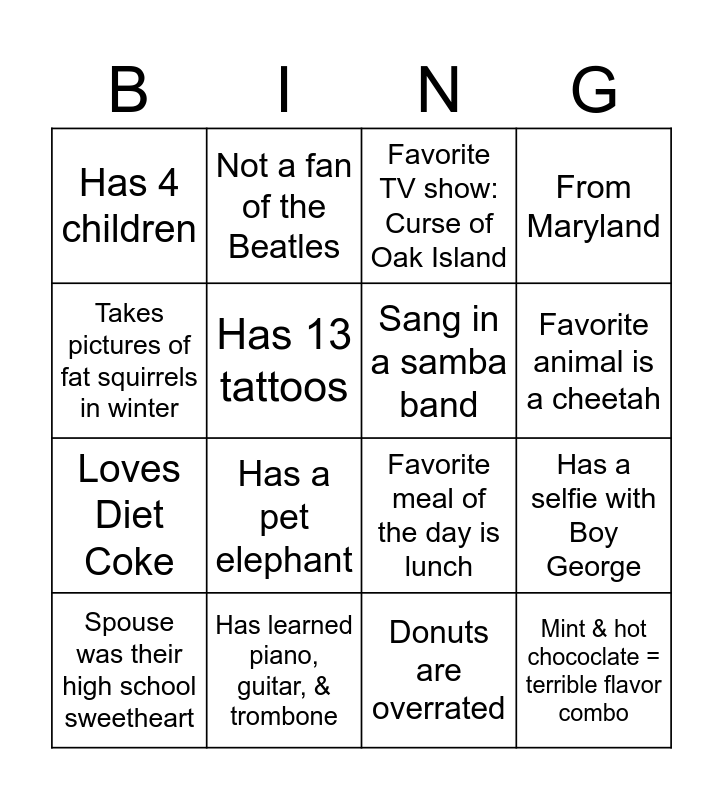 This bingo card has 88 words: Free!, 1995 BBC Pride & Prejudice is superior to 2005 Pride & Prejudice, Attended opening match of 2011 FIFA Women's World Cup in Berlin, Big Sibling for Big Brothers Big Sisters, Builds model kits to relax, Can say the alphabet backward, Can't wink, Childhood nickname was "Buck 1000", Classically trained artist, Collects sneakers, Currently studying Spanish on Duolingo, Disassembled & reassembled a vintage motorcycle and its engine, Doesn't know why people follow the Browns, Donuts are overrated, Fave coffee place: Kleifeld's in Willoughby, Favorite animal is a cheetah, Favorite animal is a snow leopard, Favorite animal is an elephant, Favorite artist is Beyonce, Favorite book: A Walk in the Woods by Bill Bryson, Favorite food: pizza, Favorite holiday is St Patrick's Day, Favorite meal of the day is lunch, Favorite movie is Batman w/Michael Keaton, Favorite movie is Pride & Prejudice 2005, Favorite movies are the Godfather Part I & II, Favorite place is Cleveland Museum of Art, Favorite reality show is Naked & Afraid, Favorite TV show is JEOPARDY!, Favorite TV show is Ted Lasso, Favorite TV show: Curse of Oak Island, From Maryland, Got knocked over (and caught!) by Jon Stewart, Had an African Albino frog, Has "morning to midnight Friendsgiving" tradition, Has 13 tattoos, Has 4 children, Has 5 kids (living), Has a Halloween Movie franchise collection, Has a pet elephant, Has a selfie with Boy George, Has a vegetable garden, Has been to 9 countries, Has hosted a podcast, Has learned piano, guitar, & trombone, Hates driving over bridges, Irrationally afraid of horses, Lifetime East Sider, Louisiana State grad, Loves Diet Coke, Loves play Pictonary but can't draw well, Loves word seek puzzles/other word games, Met Alex Ovechkin (all time leading scorer in NHL history), Met spouse at University of Minnesota, Met U2, Middle name is Kirkland, Mint & hot chococlate = terrible flavor combo, Not a fan of the Beatles, Not had a sip of coffee in nearly 6 years, Ohio State graduate, Once flipped a car & walked away physically unharmed, Played tennis & lacrosse in HS, Preferred pizza toppings: artichokes & pine nuts, Read 155 books in 2025, Regular yoga practitioner for almost 20 years, Rewatches the Sopranos every 2-3 years, Running a half marathon in 2026, Sang in a samba band, Smells Like Teen Spirit is a terrible song, Spouse was their high school sweetheart, Studied abroad in Africa, Studied abroad in Manchester, England, Studied/Lived abroad in Italy for a summer, Takes pictures of fat squirrels in winter, Took 72-hour unchartered bus trip to Mexico City, Took surfing lessons, Used to make jewelry, Wants to learn watercolor painting in 2026, Wants to make good charcuterie boards in 2026, Wants to re-learn to ski in 2026, Was a theme park mascot, Was in a touring metal band, Was in a TV commercial with HS marching band, Went to a women's college, Went to college with David Bowie's son (Duncan Jones), Wish leggings would come back in trend, Would bring back sweaters tied around your neck 80's style and Youngest of 2 children.