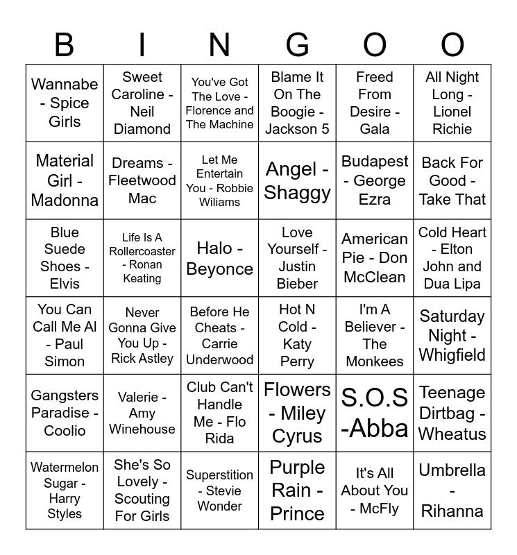 This bingo card has 51 words: Feeling Good - Michael Buble, Blue Suede Shoes - Elvis, Twistin The Night Away - Sam Cooke, I'm A Believer - The Monkees, American Pie - Don McClean, Superstition - Stevie Wonder, Sweet Caroline - Neil Diamond, Give It Up - KC and The Sunshine Band, All Night Long - Lionel Richie, Purple Rain - Prince, Material Girl - Madonna, Blame It On The Boogie - Jackson 5, Never Gonna Give You Up - Rick Astley, You Can Call Me Al - Paul Simon, Jolene - Dolly Parton, S.O.S -Abba, Dreams - Fleetwood Mac, Life Is A Rollercoaster - Ronan Keating, Rhythm Of The Night - Corona, Freed From Desire - Gala, Back For Good - Take That, Saturday Night - Whigfield, Wannabe - Spice Girls, Let Me Entertain You - Robbie Wiliams, Waterfalls - TLC, Gangsters Paradise - Coolio, Angel - Shaggy, All The Small Things - Blink 182, Before He Cheats - Carrie Underwood, You've Got The Love - Florence and The Machine, You've Got A Friend In Me - Randy Newman (From Toy Story), Teenage Dirtbag - Wheatus, Hero - Enrique Inglesias, Feel So Close - Calvin Harris, She's So Lovely - Scouting For Girls, Hot N Cold - Katy Perry, Club Can't Handle Me - Flo Rida, It's All About You - McFly, Umbrella - Rihanna, Starships - Nicki Minaj, Halo - Beyonce, Love Yourself - Justin Bieber, Timber - Pitbull ft. Kesha, Viva La Vida - Coldplay, Valerie - Amy Winehouse, Flowers - Miley Cyrus, Budapest - George Ezra, Watermelon Sugar - Harry Styles, Man I Need - Olivia Dean, Cold Heart - Elton John and Dua Lipa and Pink Pony Club - Chappell Roan.