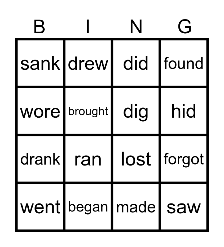 This bingo card has 20 words: went, gave, did, forgot, swam, ran, made, found, drank, drew, lost, hid, sank, began, dig, fell, wore, brought, took and saw.