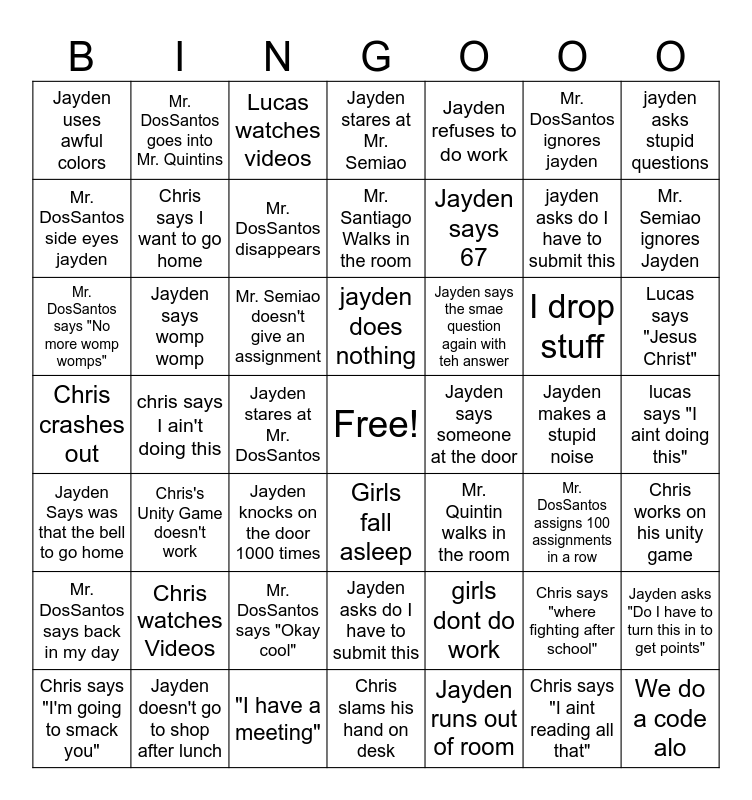 This bingo card has a free space and 48 words: Jayden Says was that the bell to go home, chris says I ain't doing this, "I have a meeting", Girls fall asleep, Jayden says 67, Jayden makes a stupid noise, jayden asks stupid questions, Chris says "I'm going to smack you", Jayden says womp womp, Jayden stares at Mr. DosSantos, Jayden stares at Mr. Semiao, Jayden refuses to do work, I drop stuff, Lucas says "Jesus Christ", Chris crashes out, Chris watches Videos, Lucas watches videos, jayden does nothing, girls dont do work, Mr. DosSantos ignores jayden, Mr. Semiao ignores Jayden, Mr. DosSantos side eyes jayden, Mr. DosSantos goes into Mr. Quintins, Mr. DosSantos disappears, Jayden runs out of room, jayden asks do I have to submit this, lucas says "I aint doing this", Mr. DosSantos says back in my day, Chris's Unity Game doesn't work, Mr. Semiao doesn't give an assignment, Jayden asks do I have to submit this, Jayden says the smae question again with teh answer, Chris says "where fighting after school", Jayden asks "Do I have to turn this in to get points", Jayden uses awful colors, Jayden doesn't go to shop after lunch, Jayden knocks on the door 1000 times, Chris slams his hand on desk, Jayden says someone at the door, Chris says "I aint reading all that", Chris works on his unity game, Mr. DosSantos says "No more womp womps", Chris says I want to go home, Mr. DosSantos says "Okay cool", Mr. Santiago Walks in the room, Mr. Quintin walks in the room, Mr. DosSantos assigns 100 assignments in a row and We do a code alo.