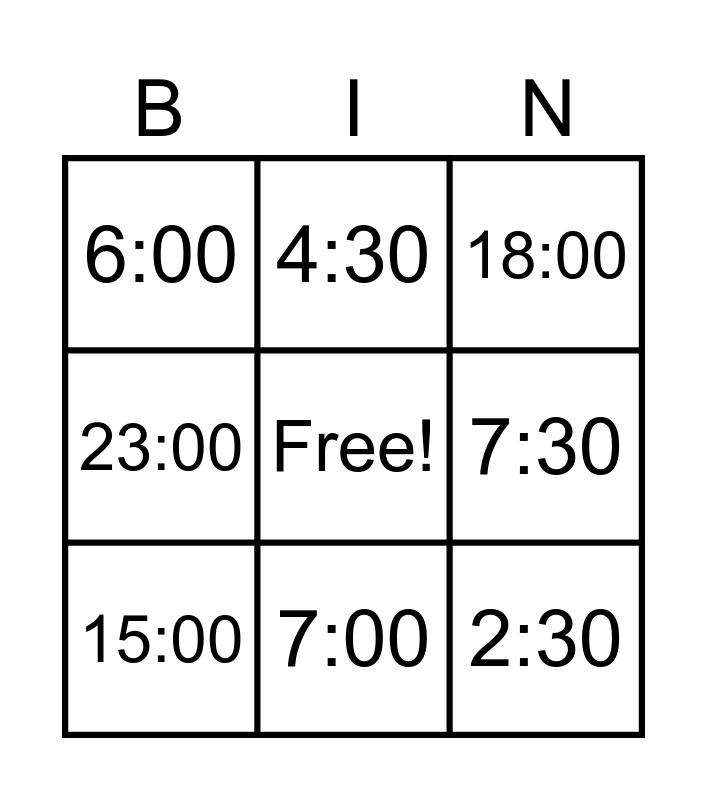 This bingo card has a free space and 24 words: 10:00, 5:00, 7:00, 8:00, 2:30, 6:00, 7:30, 4:30, 9:00, 10:00, 11:00, 12:00, 13:00, 14:00, 15:00, 16:00, 17:00, 18:00, 19:00, 20:00, 21:00, 22:00, 23:00 and 24:00.