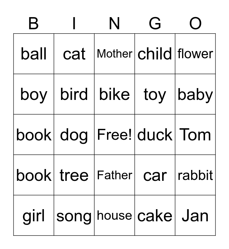This bingo card has a free space and 24 words: tree, song, bike, girl, flower, ball, boy, cat, duck, Father, toy, book, car, rabbit, bird, cake, Tom, Mother, baby, dog, Jan, book, child and house.