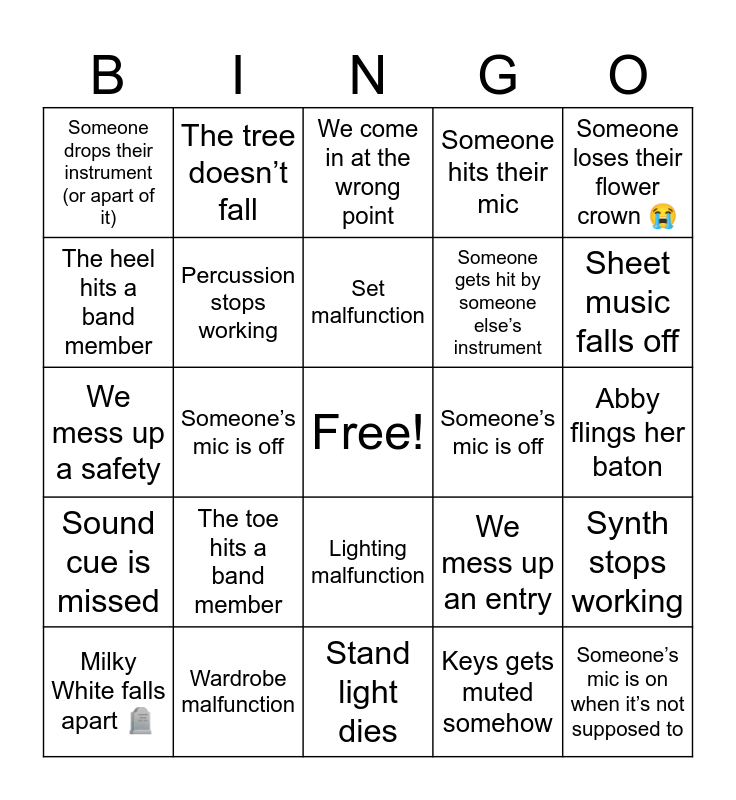 This bingo card has a free space and 24 words: The toe hits a band member, Wardrobe malfunction, Set malfunction, Milky White falls apart 🪦, Someone loses their flower crown ðŸ˜, Someone drops their instrument (or apart of it), The heel hits a band member, The tree doesn’t fall, Someone’s mic is off, Lighting malfunction, Someone gets hit by someone else’s instrument, We mess up a safety, We mess up an entry, Synth stops working, Percussion stops working, Keys gets muted somehow, Abby flings her baton, We come in at the wrong point, Sheet music falls off, Someone’s mic is off, Someone’s mic is on when it’s not supposed to, Sound cue is missed, Someone hits their mic and Stand light dies.