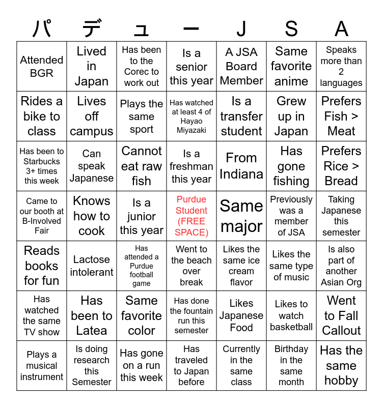 This bingo card has a free space and 48 words: Likes Japanese Food, Grew up in Japan, Has traveled to Japan before, Knows how to cook, Cannot eat raw fish, Taking Japanese this semester, Lived in Japan, Is doing research this Semester, Same favorite anime, Went to the beach over break, Speaks more than 2 languages, Is a senior this year, Has gone fishing, From Indiana, Has watched the same TV show, Previously was a member of JSA, Rides a bike to class, Prefers Fish > Meat, Likes to watch basketball, A JSA Board Member, Is a transfer student, Is a junior this year, Attended BGR, Lives off campus, Went to Fall Callout, Plays the same sport, Prefers Rice > Bread, Plays a musical instrument, Is a freshman this year, Can speak Japanese, Birthday in the same month, Same major, Is also part of another Asian Org, Has been to Latea, Came to our booth at B-Involved Fair, Likes the same ice cream flavor, Likes the same type of music, Has been to Starbucks 3+ times this week, Has attended a Purdue football game, Same favorite color, Reads books for fun, Has the same hobby, Has been to the Corec to work out, Has gone on a run this week, Has watched at least 4 of Hayao Miyazaki, Has done the fountain run this semester, Lactose intolerant and Currently in the same class.