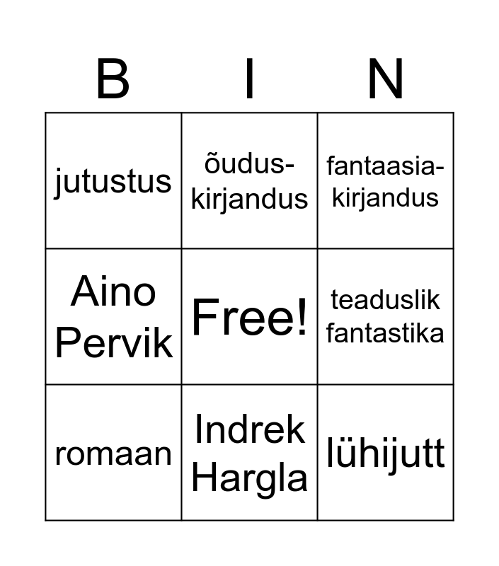 This bingo card has a free space and 8 words: teaduslik fantastika, fantaasia-kirjandus, õudus-kirjandus, romaan, jutustus, lühijutt, Aino Pervik and Indrek Hargla.