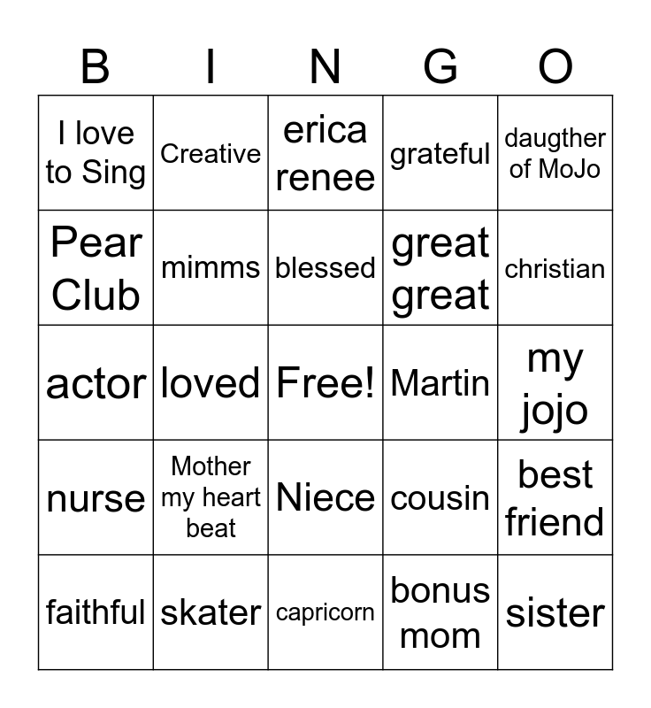 This bingo card has a free space and 24 words: Mother my heart beat, skater, blessed, faithful, daugther of MoJo, I love to Sing, Pear Club, Creative, Martin, Niece, great great, actor, cousin, best friend, mimms, bonus mom, my jojo, erica renee, christian, loved, sister, nurse, grateful and capricorn.