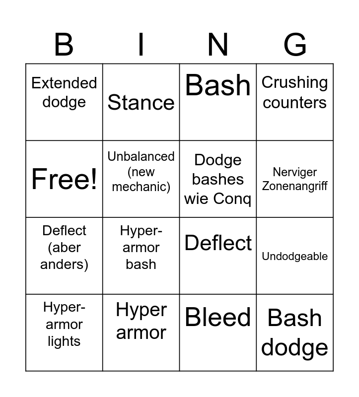 This bingo card has 16 words: Hyper armor, Undodgeable, Bash, Extended dodge, Deflect (aber anders), Stance, Deflect, Bleed, Free!, Unbalanced (new mechanic), Hyper-armor lights, Crushing counters, Hyper-armor bash, Nerviger Zonenangriff, Dodge bashes wie Conq and Bash dodge.