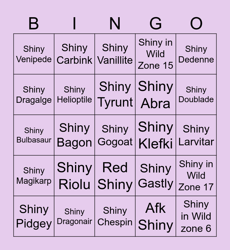 This bingo card has 165 words: Shiny in Wild Zone 1, Shiny in Wild zone 3, Shiny in Wild zone 4, Shiny in Wild Zone 5, Shiny in Wild zone 6, Shiny in Wild Zone 7, Shiny in Wild Zone 8, Shiny in Wild Zone 9, Shiny in Wild Zone 10, Shiny in Wild Zone 11, Shiny in Wild Zone 12, Shiny in Wild Zone 14, Shiny in Wild Zone 15, Shiny in Wild Zone 16, Shiny in Wild Zone 17, Shiny in Wild Zone 18, Shiny in Wild Zone 19, Shiny in Wild Zone 20, Shiny Alpha, Blue Shiny, Shiny Eevee, Shiny Baby, Shiny Chikorita, Shiny Tepig, Shiny Totodile, Shiny Fletchling, Shiny Bunnelby, Shiny Scatterbug, Shiny Weedle, Shiny Diggersby, Shiny Spewpa, Shiny Vivillon, Shiny Weedle, Shiny Kakuna, Shiny Pidgey, Shiny Pidgeotto, Shiny Mareep, Shiny Flaaffy, Shiny Patrat, Shiny Budew, Shiny Roselia, Shiny Roserade, Shiny Magikarp, Shiny Binacle, Shiny Binacle, Shiny Staryu, Shiny Flabébé, Shiny Skiddo, Shiny Gogoat, Shiny Espurr, Shiny Litleo, Shiny Pyroar, Shiny Pancham, Shiny Trubbish, Shiny Garbodor, Shiny Dedenne, Shiny Pichu, Shiny Pikachu, Shiny Cleffa, Shiny Clefairy, Shiny Spinarak, Shiny Ariados, Shiny Ekans, Shiny Abra, Shiny Kadabra, Shiny Gastly, Shiny Venipede, Shiny Whirlipede, Shiny Honedge, Shiny Doublade, Shiny Bellsprout, Shiny Pansage, Shiny Pansear, Shiny Pansear, Shiny Meditite, Shiny Electrike, Shiny Ralts, Shiny Gardevoir, Shiny Houndour, Shiny Houndoom, Shiny Swablu, Shiny Altaria, Shiny Audino, Shiny Spritzee, Shiny Swirlix, Shiny Buneary, Shiny Shuppet, Shiny Vanillite, Shiny Numel, Shiny Hippopotas, Shiny Hippowdon, Shiny Drilbur, Shiny Excadrill, Shiny Sandile, Shiny Krokorok, Shiny Machop, Shiny Machoke, Shiny Machoke, Shiny Carbink, Shiny Sableye, Shiny Mawile, Shiny Absol, Shiny Riolu, Shiny Lucario, Shiny Slowpoke, Shiny Carvanha, Shiny Tynamo, Shiny Dratini, Shiny Dragonair, Shiny Charmander, Shiny Squirtle, Shiny Bulbasaur, Shiny Stunfisk, Shiny Furfrou, Shiny Inkay, Shiny Malamar, Shiny Skrelp, Shiny Dragalge, Shiny Clauncher, Shiny Goomy, Shiny Delibird, Shiny Snorunt, Shiny Snorunt, Shiny Bergmite, Shiny Scyther, Shiny Pinsir, Shiny Heracross, Shiny Emolga, Shiny Hawlucha, Shiny Phantump, Shiny Scraggy, Shiny Scrafty, Shiny Noibat, Shiny Noibat, Shiny Klefki, Shiny Litwick, Shiny Lampent, Shiny Aerodactyl, Shiny Tyrunt, Shiny Amaura, Shiny Onix, Shiny Aron, Shiny Lairon, Shiny Aggron, Shiny Helioptile, Shiny Pumpkaboo, Shiny Larvitar, Shiny Froakie, Shiny Falinks, Shiny Chespin, Shiny Skarmory, Shiny Fennekin, Shiny Bagon, Shiny Kangaskhan, Shiny Drampa, Shiny Beldum, Shiny Metang, Pink Shiny, White Shiny, Red Shiny, Brown Shiny, Green Shiny, Black Shiny, Afk Shiny and DLC Exclusive Shiny.
