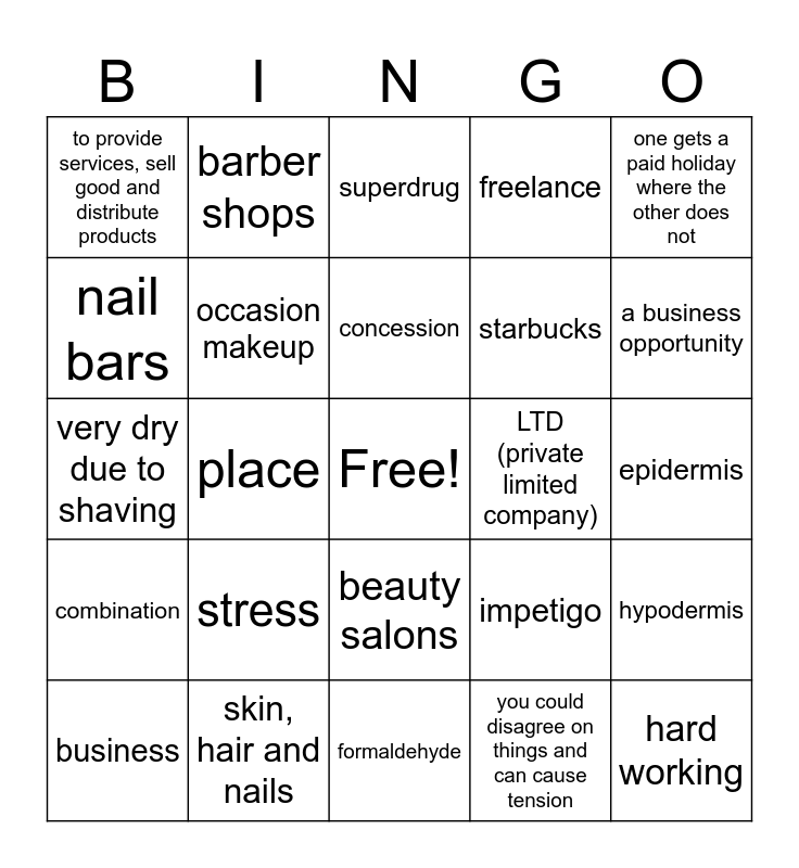 This bingo card has a free space and 29 words: acne, skin, hair and nails, superdrug, burns and damaged skin, one gets a paid holiday where the other does not, to provide services, sell good and distribute products, occasion makeup, concession, LTD (private limited company), hypodermis, business, place, you could disagree on things and can cause tension, hard working, very dry due to shaving, burns, allergic reaction, formaldehyde, impetigo, a business opportunity, combination, stress, is where all the, sweat/ oil glands are, starbucks, epidermis, nail bars, barber shops, beauty salons, freelance and sole trader.